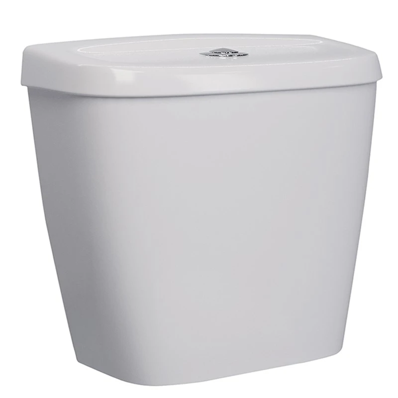 A white ceramic exposed low level cistern with push button flush – bottom entry inlet/overflow
