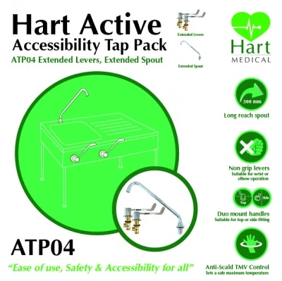 Supplied complete with extended lever panel valves (can be elbow or wrist operated) , long reach (300mm) Â swivel spout, special 800mm flexible connections and TMV2/3 ‘safety temperature’ Mixing Valve