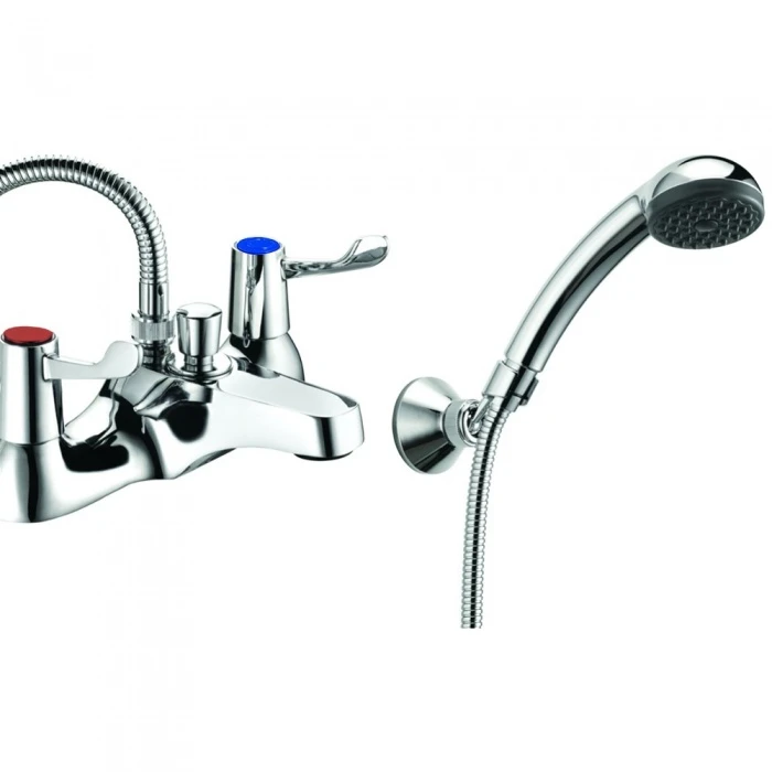 A lever action bath shower mixer tap and shower kits with high visibility care indices on the levers to assist users with visual impairment – suitable for domestic and care home use
