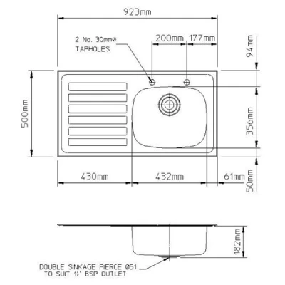 A ‘no overflow’ inset mounted sinktop with drainer made from 304 grade stainless steel – available with left or right handed drainer
